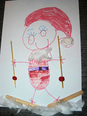 Mama napisała: Małgosia zrobiła 2 prace. Jednego mikołaja namalowała kredą na tablicy i przykleiła mu brodę z waty, a drugiego mikołaja namalowała razem z bałwankiem i choinką. Na drugim obrazku mikołaj ma głowę zrobioną z wacika (na głowi Małgosia namalowała mu garnek, bo powiedziała, że czapki jeszcze nie umie malować) a bałwanek jest cały z wacików. Śnieg Małgosia zrobiła pastą do zębów. Gdy obrazek wysechł namalowała mazakiem śnieżynki.